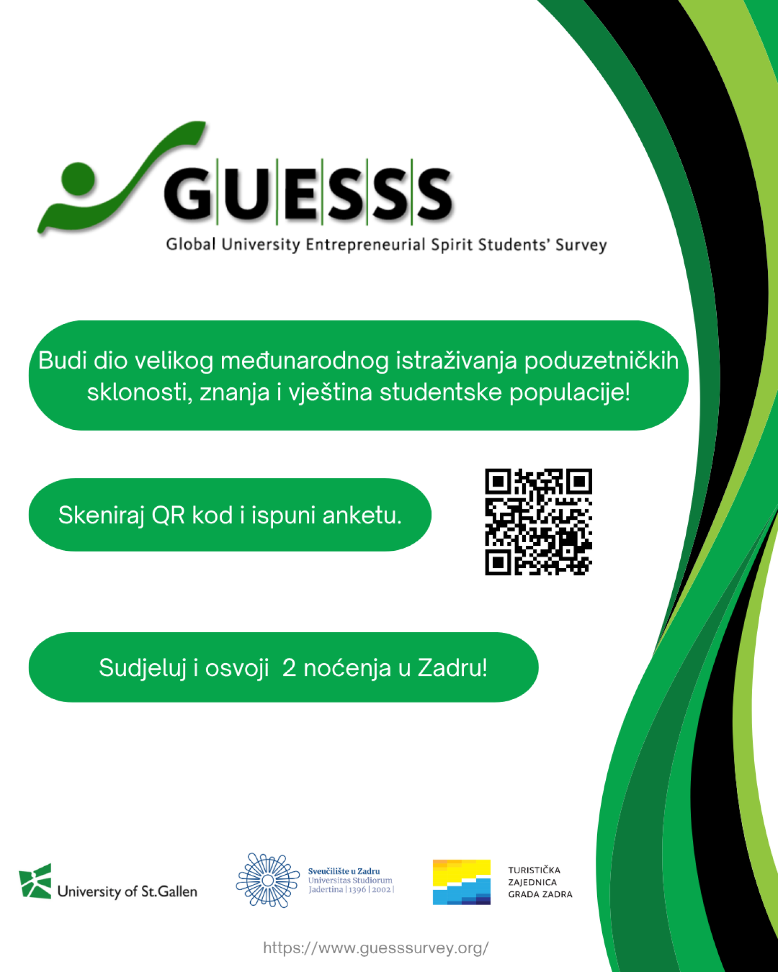 molimo vas da izdvojite 10-15 minuta svog vremena i sudjelujete u međunarodnom istraživanju GUESSS 2025. Ovim se istraživanjem ispituju poduzetničke sklonosti, znanja i vještine studentske populacije.