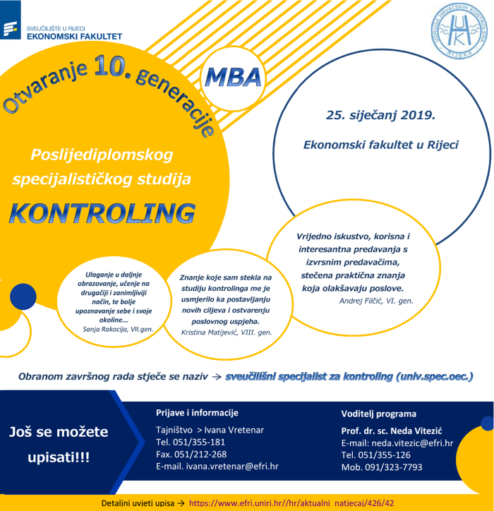 -pristupnici koji nisu završili studij iz znanstvenog područja ekonomije, trebaju imati najmanje trogodišnje iskustvo u struci relevantnoj za obavljanje kontroling funkcije ili dokazati poznavanje osnovnih znanja iz ekonomije polaganjem slijedećih predmeta: Osnove ekonomije, Menadžment i Računovodstvo