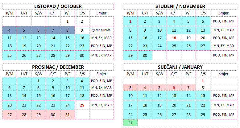 a.       Nastavu koju prati samo jedan smjer (npr. smjer International Business), predmeti koji se izvode samo na jednom smjeru (npr. obvezni predmeti smjera) -  nastava se izvodi svaki tjedan u dvorani