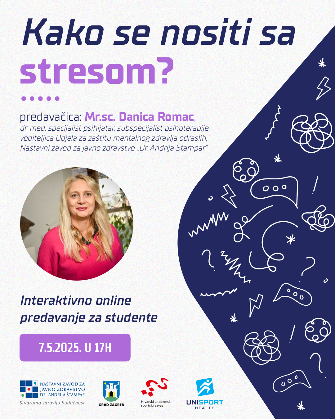 Služba za mentalno zdravlje i prevenciju ovisnosti NZJZ „Dr. Andrija Štampar" u suradnji s Hrvatskim akademskim sportskim savezom organizira interaktivno online predavanje za studente pod nazivom: „Kako se nositi sa stresom?"