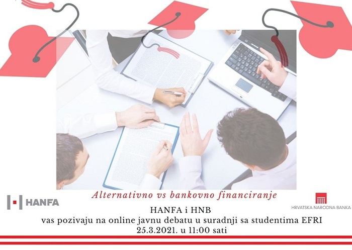 Hanfa i HNB pozivaju zainteresiranu javnost na online javnu raspravu „Alternativno vs. bankovno financiranje", koju će održati studenti Ekonomskog fakulteta u Rijeci. Debata će se održati 25. ožujka 2021. s početkom u 11 sati, a pridružiti se mogu svi zainteresirani prethodnom prijavom na