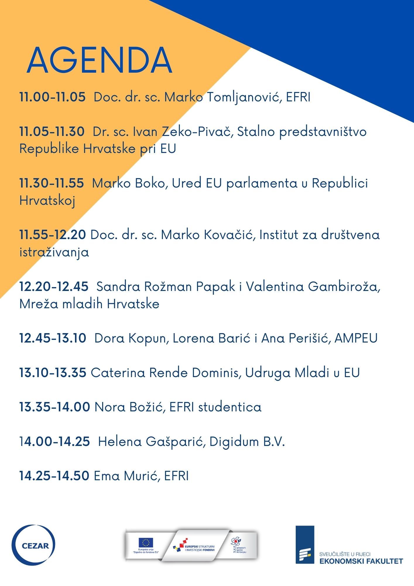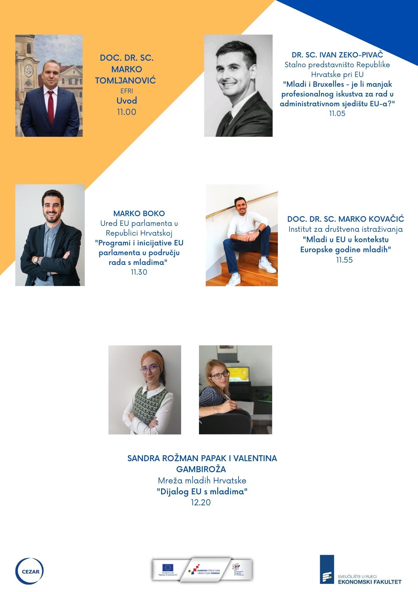 Online Studentska konferencija pod nazivom „Mladi i EU: Mogućnosti i prilike zajedničke budućnosti" okupit će u virtualnom okruženju stručnjake koji se u svojim karijerama bave politikama EU usmjerenima prema mladima, predstavnike europskih tijela, udruga, institucija te EFRI studenticu i EFRI alumni. Predavači će dati uvid u to kako današnje generacije mladih osoba predstavljaju budućnost naše zemlje i Europske unije.