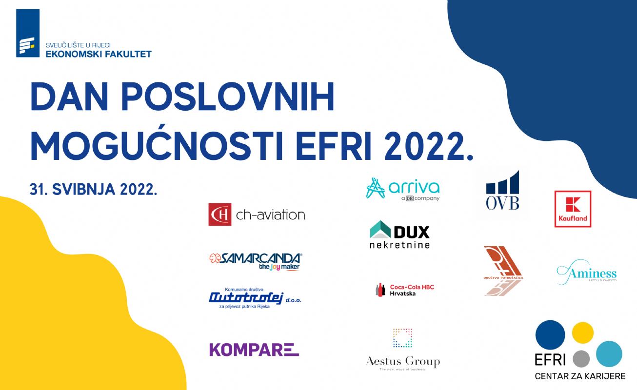 Drugi po redu Dan poslovnih mogućnosti EFRI 2022. bit će održan 31. svibnja 2022. s ciljem povezivanja studenata i potencijalnih poslodavaca kroz speed dating intervjue, kratke 10-minutne razgovore za posao. Dan poslovnih mogućnosti je događaj koji omogućuje ostvarivanja suradnje između studenata i poslodavaca u vidu zapošljavanja, primanja na stručnu praksu/pripravništvo, sezonske poslove za studente nižih godina te stipendiranje studenata ekonomije i poslovne ekonomije+ kao i uvrštavanje u bazu potencijalnih zaposlenik. Otvoreni natječaji za EFRI studente i alumnije su dostupni ovdje.