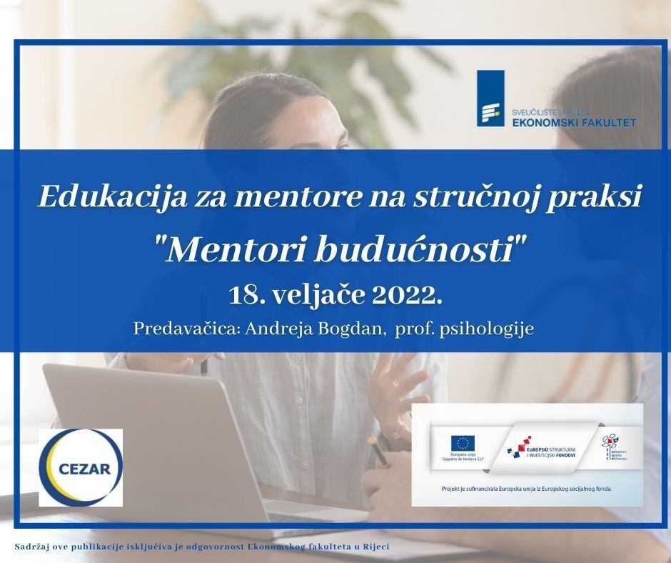 U sklopu EU projekta „Povećanje zapošljivosti studenata kroz unapređenje Centra za karijere i razvoj stručne prakse – CEZAR", čiji je nositelj Ekonomski fakultet Sveučilišta u Rijeci, Centar za karijere organizira radionicu na temu „Mentori budućnosti - program za mentore na stručnoj praksi", a koja će se održati 18. veljače 2022. godine s početkom u 9 sati putem Zoom platforme.