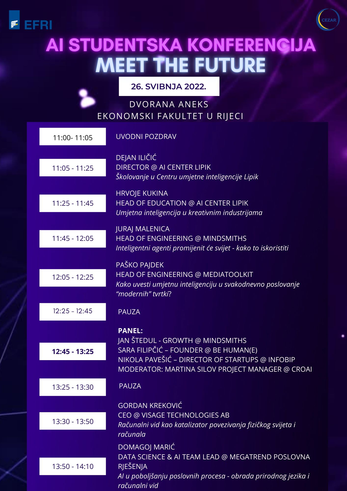 Pozivamo Vas da nam se pridružite, u četvrtak 26. svibnja 2022. s početkom u 11 sati na Studentskoj konferenciji "Meet The Future” koja će se održati u dvorani Aneks Fakulteta.