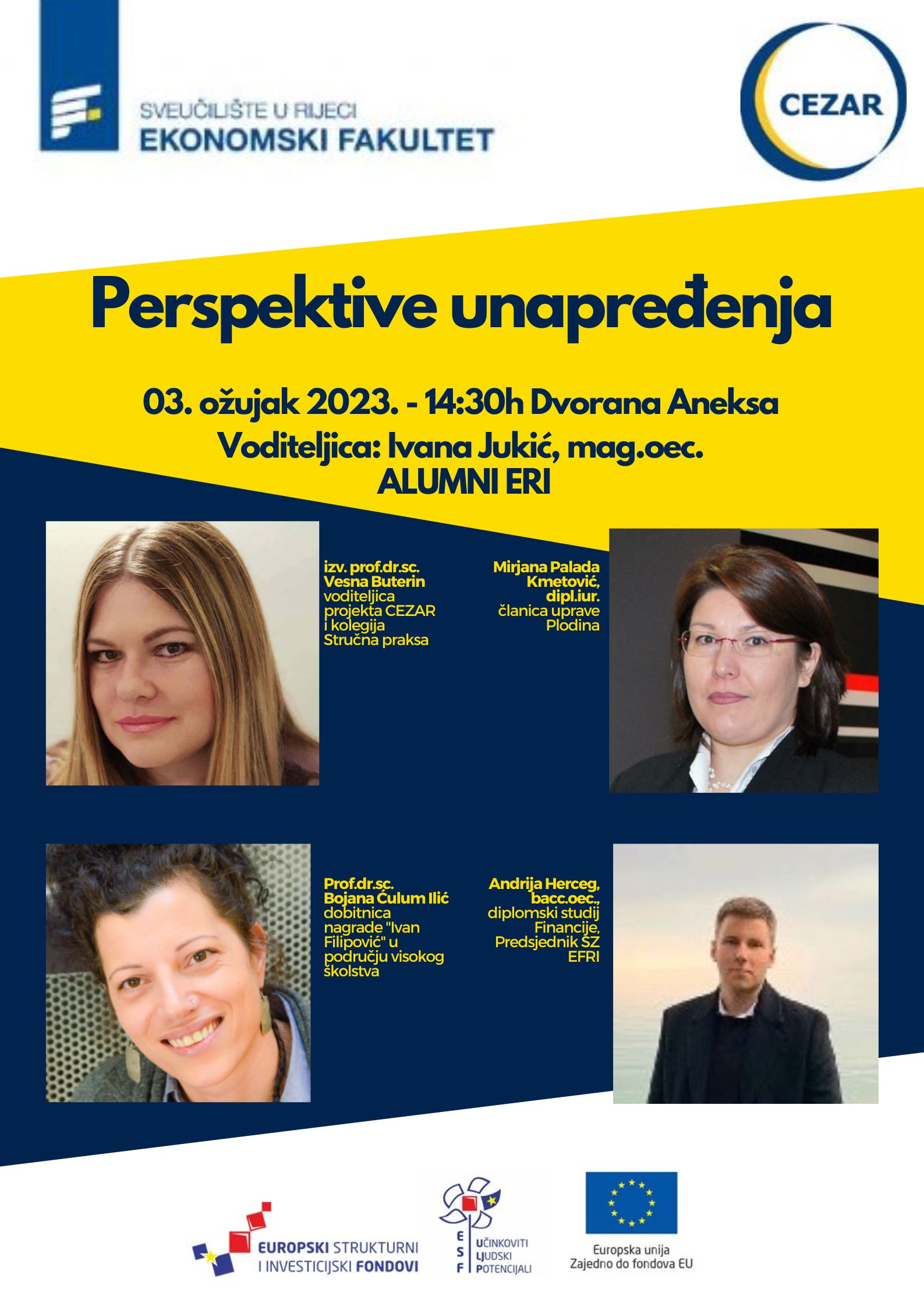 U drugom dijelu programa bit će održana panel rasprava pod nazivom "Perspektive unapređenja” na kojoj će sudjelovati izv. prof. dr. sc. Vesna Buterin, prodekanica za suradnju s gospodarstvom i poslovanje te ujedno i voditeljica projekta CEZAR te nositeljica kolegija Stručna praksa, prof. dr. sc. Bojana Ćulum Ilić, dobitnica nagrade "Ivan Filipović” u području visokog školstva, Mirjana Palada Kmetović dipl.iur. , članica uprave poduzeća Plodine i Andrija Herceg bacc.oec., student diplomskog studija Financije te Predsjednik SZ Ekonomskog fakulteta u Rijeci.