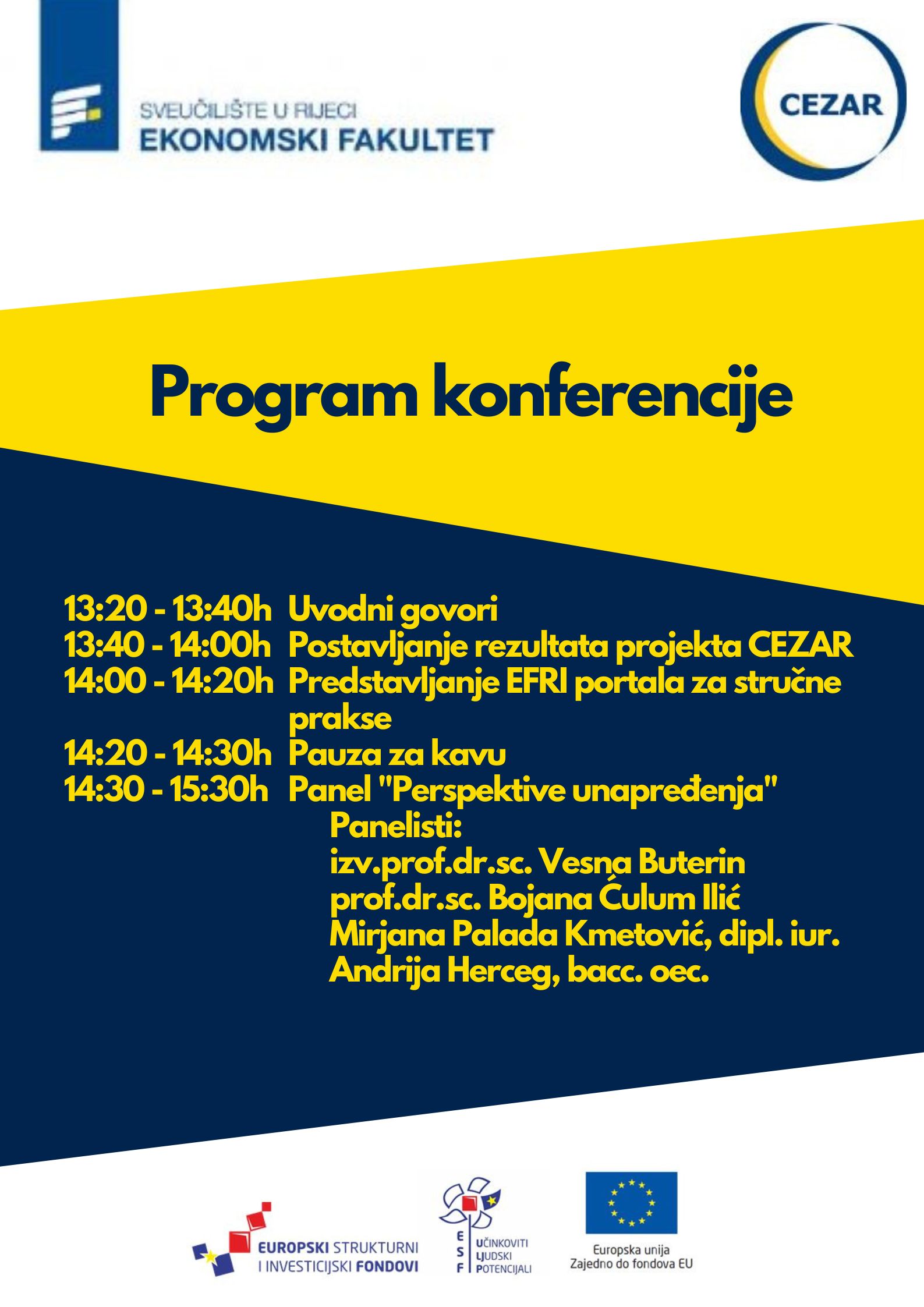 Program završne konferencije započinje predstavljanjem rezultata projekta CEZAR i novog EFRI portala za stručne prakse putem kojeg svi studenti završnih godina mogu pronaći praksodavca za svoju Stručnu praksu, koja je u sklopu novih nastavnih programa uvrštena u obvezne kolegije za redovne ali i izvanredne studente prijediplomskih, diplomskih i integriranih studija s bitno povećanim brojem sati.