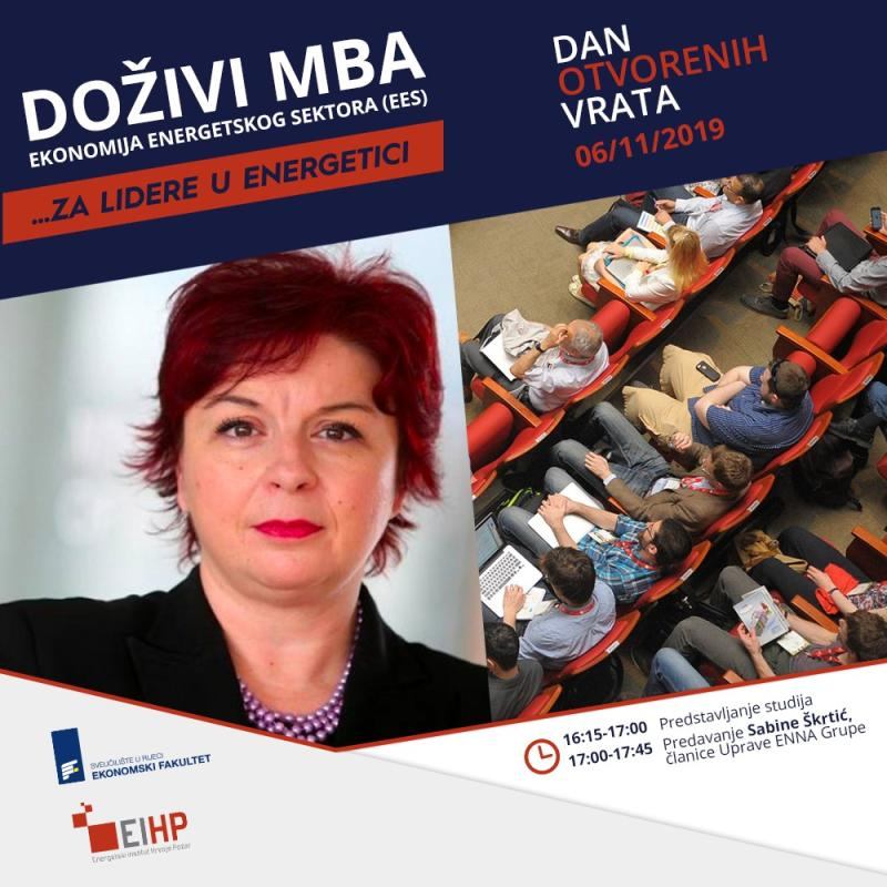 Predavanje gđe. Sabine Škrtić (ENNA) na Danu otvorenih vrata MBA Ekonomije energetskog sektora (EES) (EIHP, Savska cesta 163) je prilika za doživjeti jedinstven interdisciplinaran poslijediplomski MBA studij koji predstavlja spoj međunarodne menadžerske prakse i najnovijih dostignuća u domeni energetike.