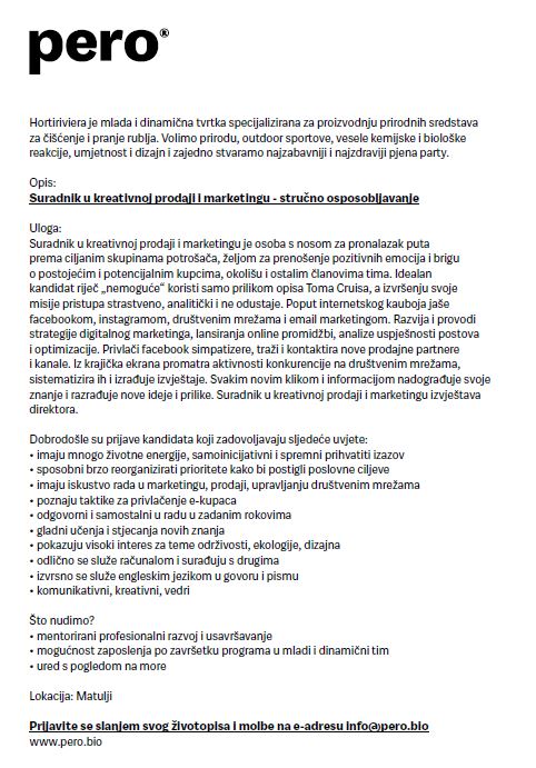 Koga je zaintersirao ovaj opis sigurno će ga zanimati i činjenica da traže suradnika u kreativnoj prodaji i marketingu. Više detalja potražite u nastavku, a rok prijave je: 7. travanja!