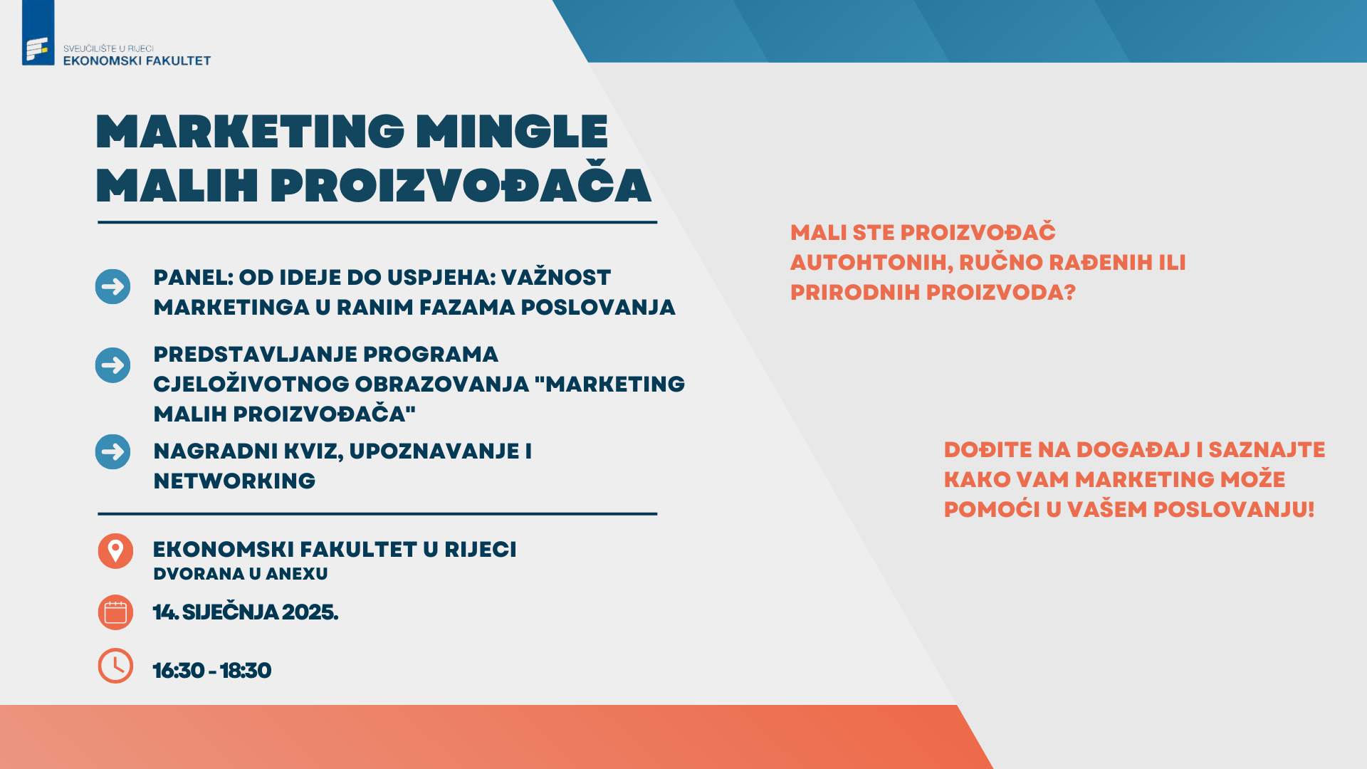 Nakon prošlogodišnjeg uspješnog prvog izdanja, događaj "Marketing Mingle Malih Proizvođača" vraća se s novim programom i prilikama za male proizvođače da unaprijede svoje poslovanje kroz marketing. Drugo izdanje ovog događaja održat će se 14. siječnja 2025. na Ekonomskom fakultetu u Rijeci, u velikoj dvorani u aneksu, s početkom u 16:30 sati.