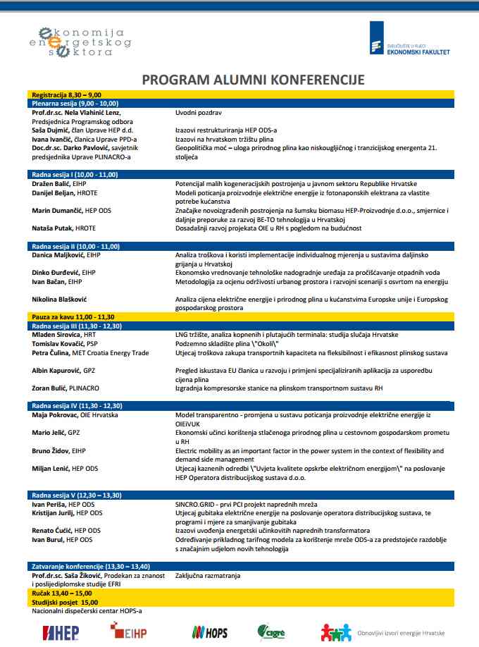 10. listopada 2018. u hotelu Antunović, Zagreb, održana je PRVA Alumni konferencija: SUVREMENI IZAZOVI U ENERGETICI na Poslijediplomskom MBA studiju Ekonomija energetskog sektora s početkom u 09:00 sati. Konferenciju je organizirao Ekonomski fakultet Sveučilišta u Rijeci (EFRI), EIHP te HEP u suradnji s partnerima. Konferencija je zatvorenog tipa te na njoj mogu prisustvovati samo Alumniji i polaznici MBA studija.