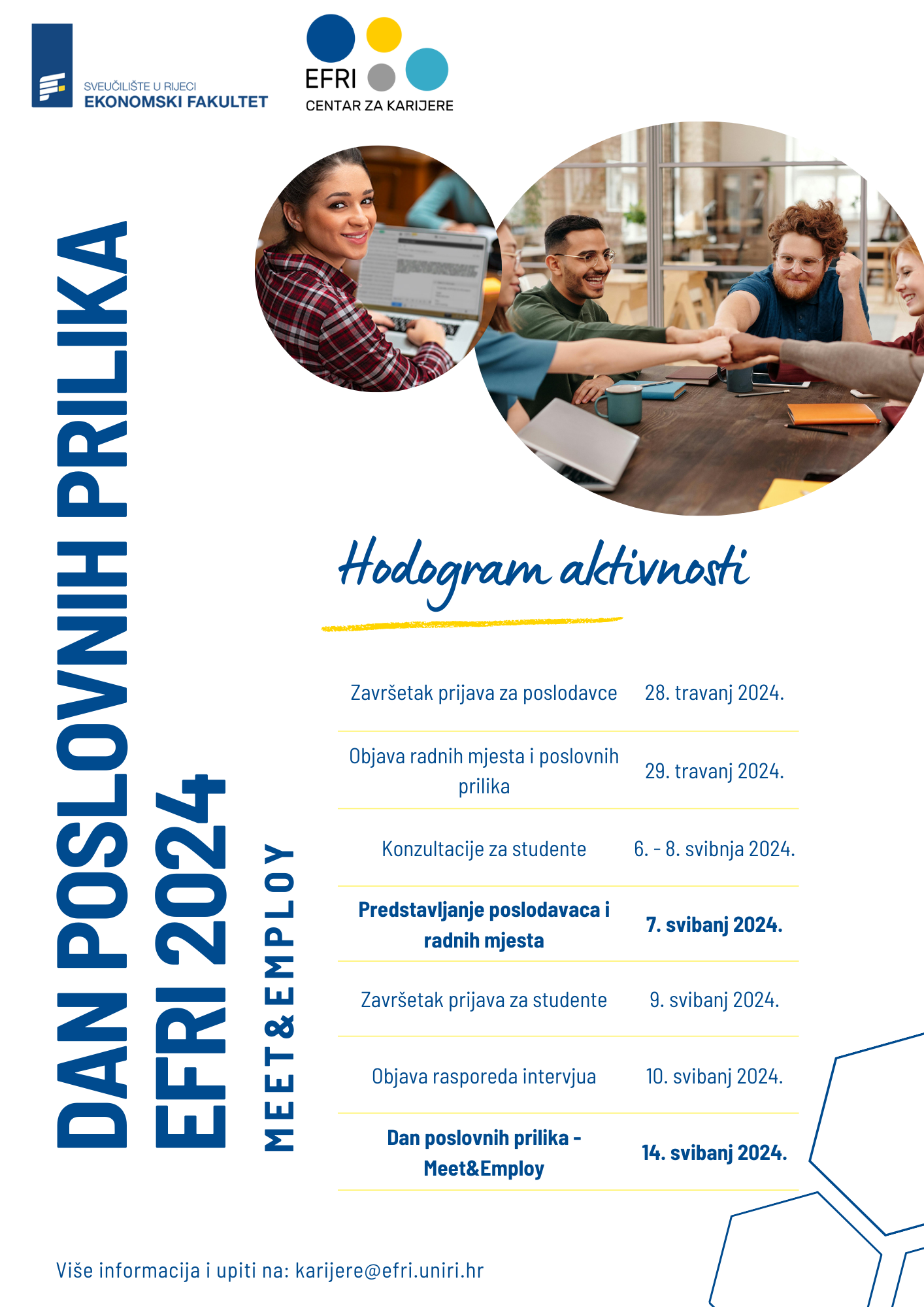 Centar za karijere Ekonomskog fakulteta Sveučilišta u Rijeci četvrtu godinu za redom organizira Dan poslovnih prilika – Meet&Employ, događaj namijenjen povezivanju poslodavaca i studenata kroz speed dating intervjue.