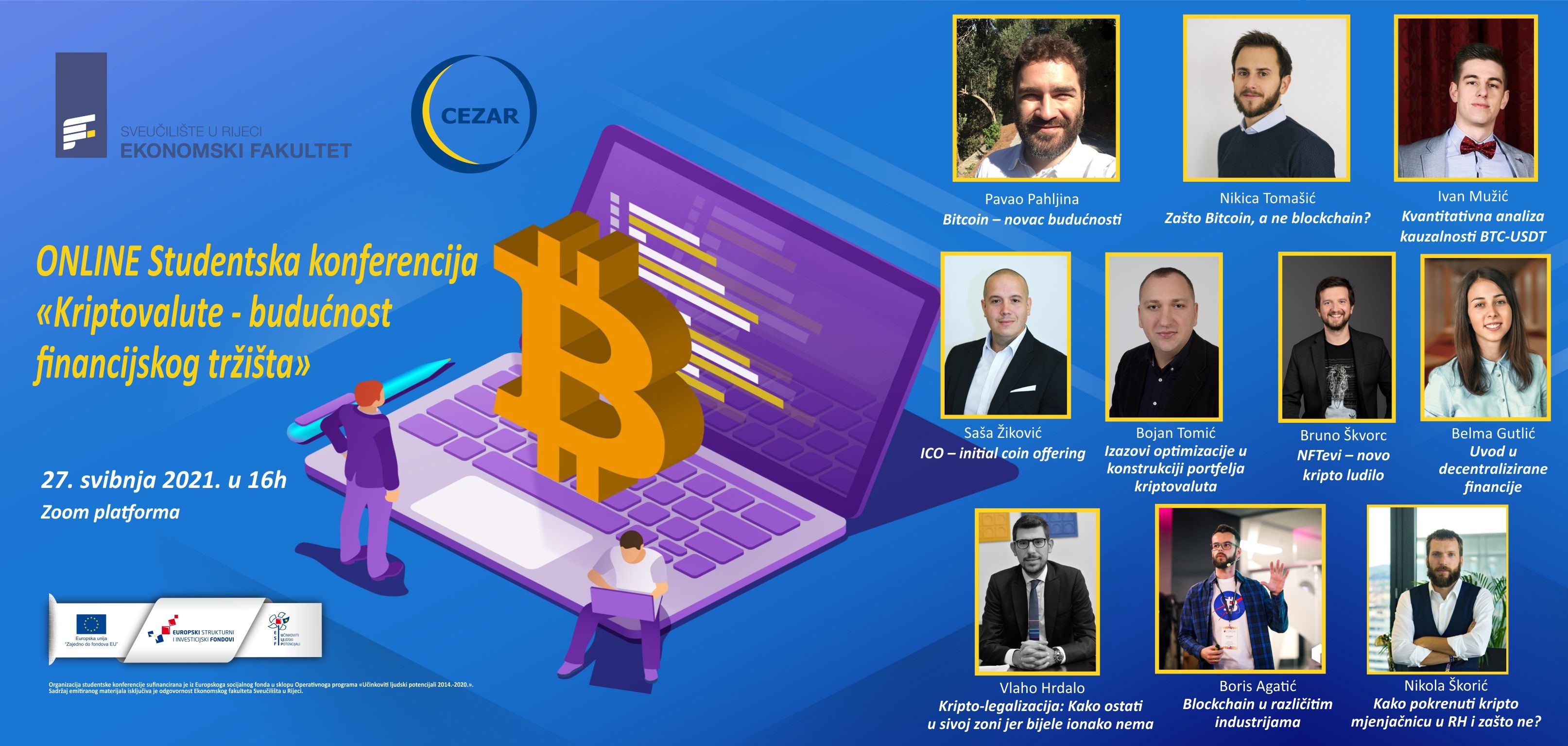 Posljednjih godina kriptovalute i koncept blockchaina privlače pozornost široke publike, kako stručnjaka, tako i laika. Kako biste se što bolje upoznali s različitim pojmovima iz svijeta digitalnog novca i tehnologije koja stoji iza njega, organizirali smo online studentsku konferenciju na kojoj će naši predavači obraditi različite teme, te odgovoriti na brojna pitanja, među kojima i jesu li kriptovalute uistinu budućnost financijskog tržišta.