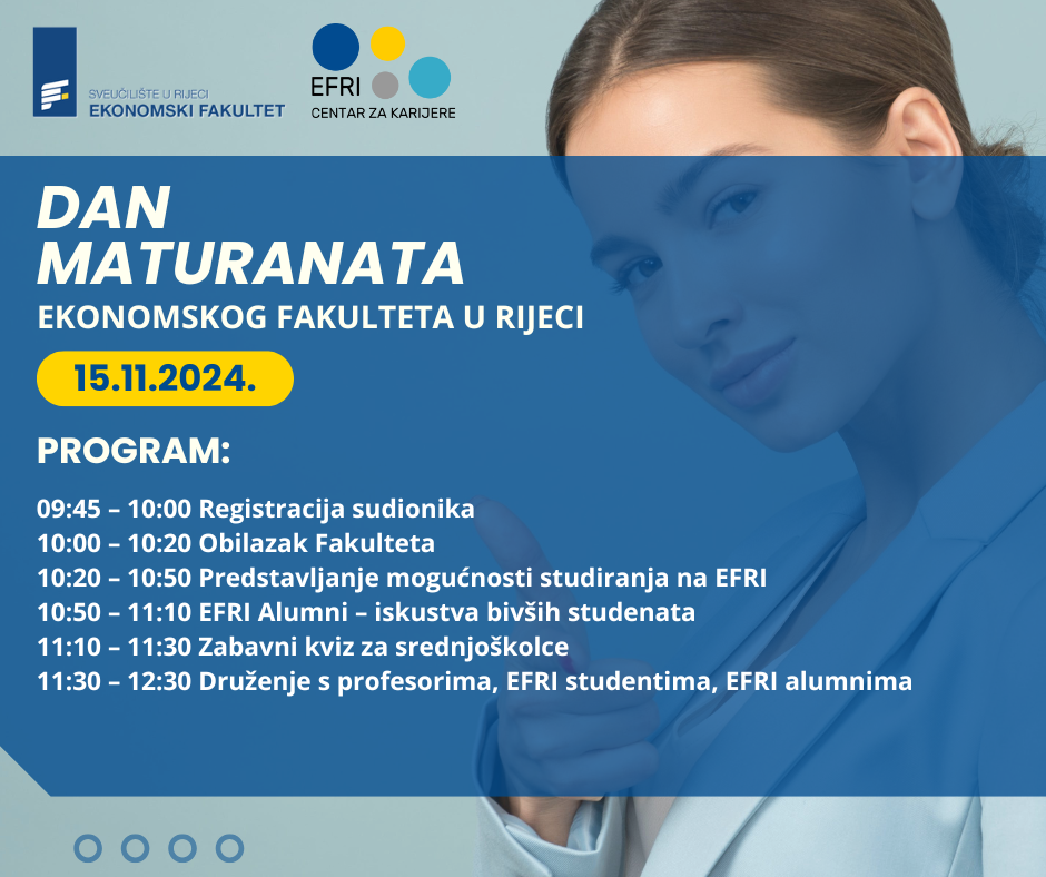 Posljednji dan Tjedna karijera, petak 15. studenog, posvećen je maturantima koji će imati priliku zaviriti u akademsku zajednicu EFRI-ja. Tijekom posjeta Ekonomskom fakultetu u Rijeci, maturanti će kroz prezentaciju, druženje sa sadašnjim studentima i interaktivne aktivnosti doznati više o studijskim programima, studentskom životu te mnogim mogućnostima i prednostima koje EFRI nudi za izgradnju uspješne karijere.