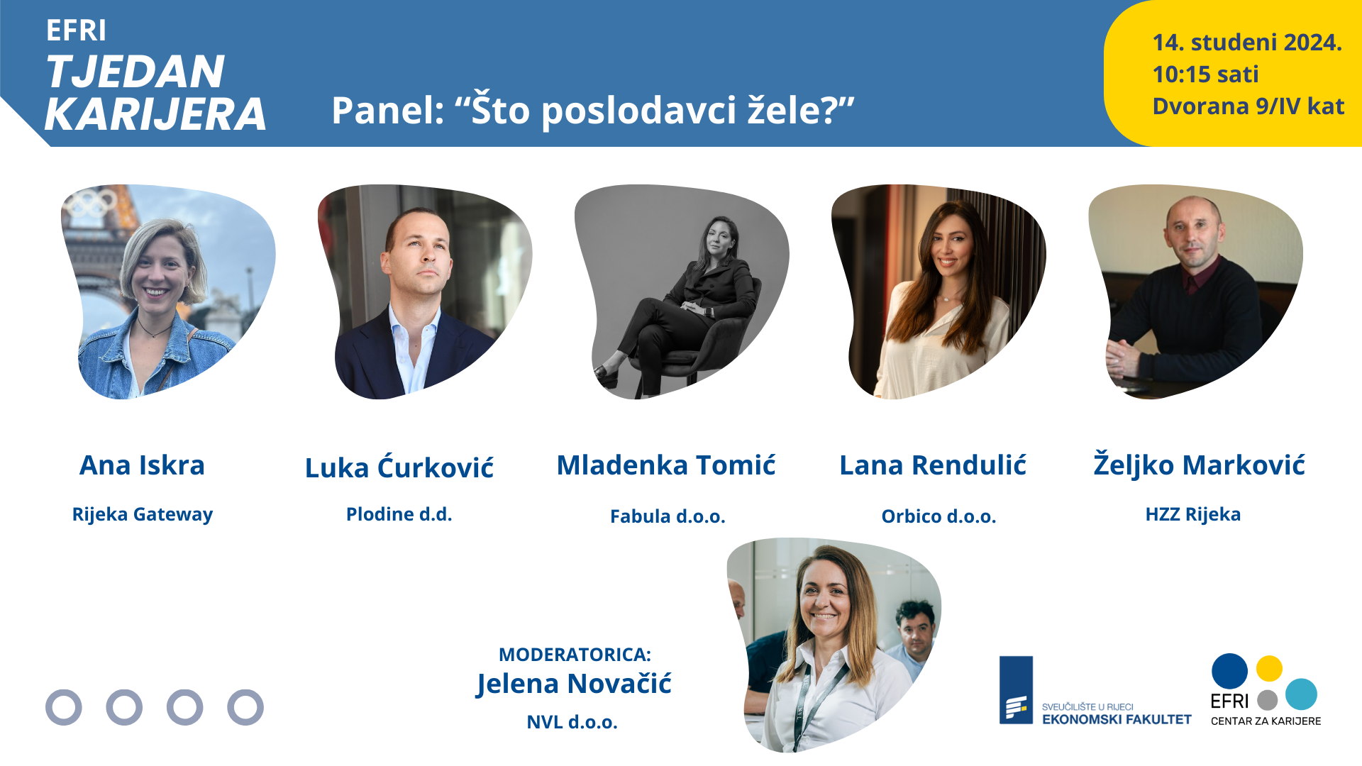 Ugledni stručnjaci iz područja upravljanja ljudskim resursima i zapošljavanja – Luka Ćurković (Plodine d.d.), Ana Iskra (Rijeka Gateway), Željko Marković (HZZ Rijeka), Lana Rendulić (ORBICO) i Mladenka Tomić (Fabula d.o.o.), pod moderacijom Jelene Novačić (NVL d.o.o.), nastojat će odgovoriti na ključna pitanja koja muče studente pri prelasku iz akademskog svijeta na tržište rada, uključujući teme kao što su potrebne vještine, prilagodljivost, očekivanja poslodavaca i kako se istaknuti među kandidatima.